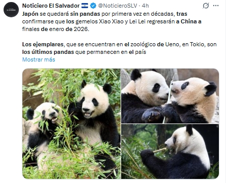 Los dos únicos pandas gigantes que permanecen en Japón, los gemelos Xiao Xiao y Lei Lei, podrían ser devueltos a China antes de lo previsto, a finales de enero, según informó la agencia Kyodo. Nacidos en 2021 en el zoológico de Ueno, en Tokio, los pandas son propiedad de China y su permanencia en el país estaba regulada por un acuerdo de préstamo que expiraba en febrero.