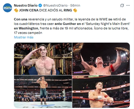En una función cargada de emoción y nostalgia, el excampeón mundial cayó por rendición frente a Gunther, dos veces monarca de peso pesado de la WWE, en un desenlace que sorprendió a muchos aficionados. Lejos del final triunfal que algunos esperaban, Cena cerró su histórica carrera sobre el ring mostrando una faceta vulnerable, marcando así un adiós memorable y fiel al dramatismo de la lucha libre profesional.