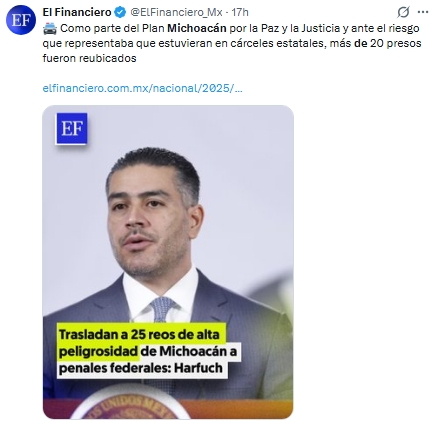 El secretario de Seguridad de México, Omar García Harfuch, informó que 25 delincuentes considerados de alta peligrosidad fueron trasladados desde cárceles estatales de Michoacán a distintos penales federales como parte del plan Michoacán por la Paz y la Justicia.