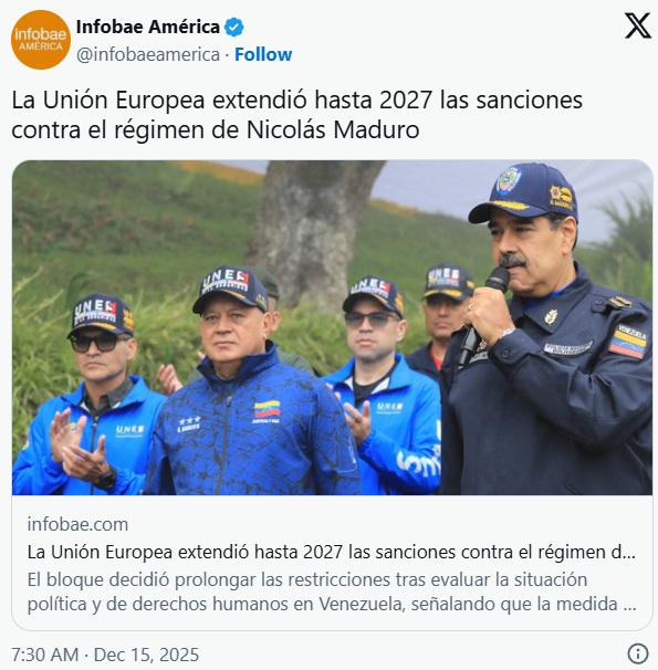 Los ministros de Exteriores de la Unión Europea (UE) prolongaron este lunes por un año, hasta el 10 de enero de 2027, las sanciones europeas impuestas contra el régimen de Nicolás Maduro en Venezuela, a raíz de la crisis generada en el país por la imposición del modelo chavista.