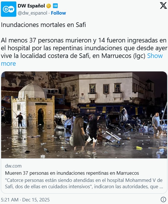 Al menos 37 personas murieron por unas inundaciones repentinas ocurridas el domingo en la localidad costera marroquí de Safi, azotada por fuertes lluvias, según el nuevo balance comunicado por las autoridades locales este lunes.