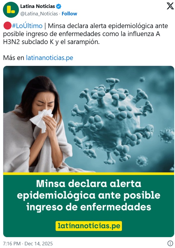 Las autoridades sanitarias de Perú declararon el domingo alerta epidemiológica a nivel nacional, en previsión del probable ingreso al país de enfermedades como la influenza A H3N2 subtipo K y el sarampión, informó el Ministerio de Salud (Minsa).