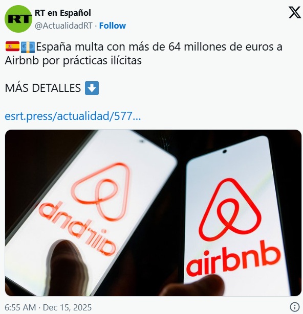 El Ministerio de Derechos Sociales, Consumo y Agenda 2030 de España ha impuesto una multa de más de 64 millones de euros a la plataforma de alquiler de alojamientos Airbnb por anunciar viviendas para uso turístico sin licencia, entre otras infracciones detectadas.