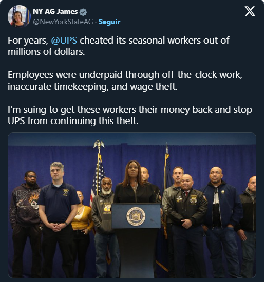 La Fiscalía General de Nueva York presentó una demanda contra la empresa de mensajería UPS por un supuesto robo de salarios que habría afectado a empleados temporales contratados durante picos de alta demanda.