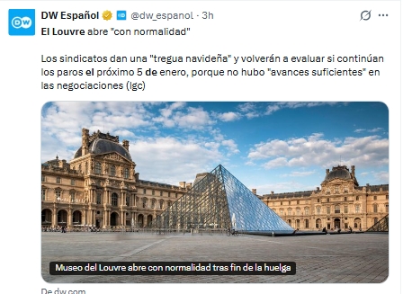 El Museo del Louvre de París reabrió este viernes todas sus instalaciones y retomó su funcionamiento con normalidad, luego de que los sindicatos confirmaran el fin de la huelga iniciada a comienzos de la semana. Aunque los trabajadores votaron en asamblea no continuar con el paro, advirtieron que se trata de una “tregua navideña” ante la falta de avances sustanciales en las negociaciones con el Ministerio de Cultura.