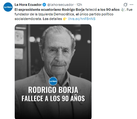 El presidente Noboa expresó sus condolencias y destacó que Borja “estará para siempre en la memoria del Ecuador”, subrayando el legado político y social que dejó durante su vida pública.