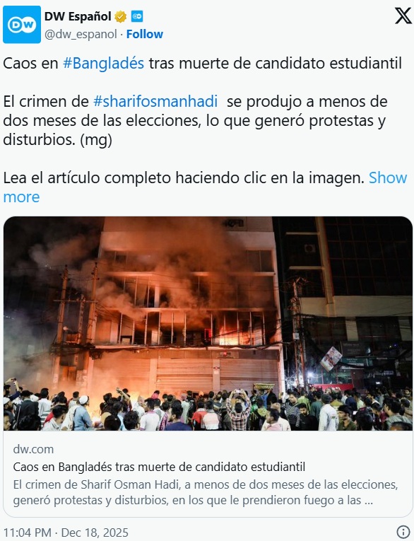 La muerte del líder estudiantil y aspirante a diputado Sharif Osman Hadi desató la violencia en Bangladés, donde turbas de seguidores incendiaron anoche las sedes de los principales periódicos y sembraron el caos en la capital, en lo que el Gobierno interino califica como un "sabotaje" diseñado para descarrilar las elecciones de febrero, informaron este viernes autoridades.