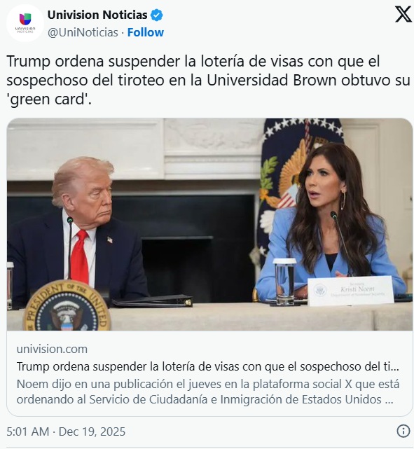 "El autor del tiroteo en la Universidad de Brown, Claudio Manuel Neves Valente, ingresó a EE.UU. a través del programa de visas de inmigrante por lotería de diversidad (DV1) en 2017 y se le concedió la residencia permanente ('Green Card')", reza el texto. "Este atroz individuo nunca debió haber sido admitido en nuestro país", añade.
