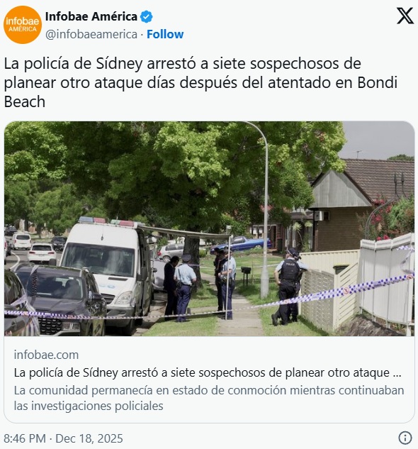 Según señaló este viernes el comisario adjunto David Hudson, existen "algunos indicios" de que la playa Bondi, que el domingo fue escenario de un masivo tiroteo que dejó 15 víctimas mortales durante una celebración judía, podría haber sido uno de los lugares que los arrestados planeaban visitar. Además, indicó que "en esta fase" de la investigación se cree que los hombres mantienen vínculos con "una ideología islamista extremista".