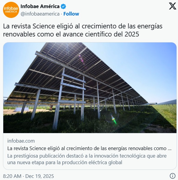 La publicación destacó que estamos ante un cambio de paradigma en el sistema energético global, ya que por primera vez estas fuentes limpias superaron al carbón en la generación de electricidad a nivel mundial y han cubierto todo el aumento de la demanda eléctrica durante la primera mitad del año, según datos de la revista científica.