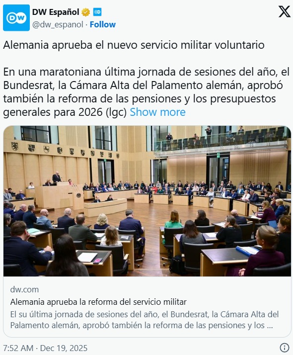 La nueva ley del servicio militar alemán entrará en vigor el 1 de enero, tras ser aprobada elste viernes por la Cámara Alta del Parlamento alemán, el Bundesrat. El proyecto de ley establece que los hombres jóvenes se sometan a exámenes médicos y se inscriban en una lista para el servicio militar, mientras que el servicio activo sigue siendo voluntario.
