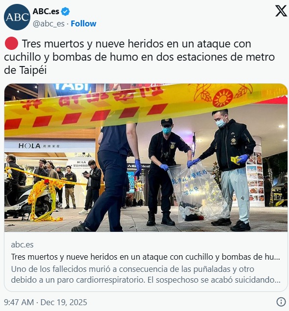 Al menos nueve personas resultaron heridas este viernes en un ataque indiscriminado con granadas de humo y cuchillo en una estación del metro de Taipéi, capital de Taiwán (China). Tras el ataque, el hombre se desplazó en tren hasta otra estación, salió a la calle y lanzó más granadas de humo.