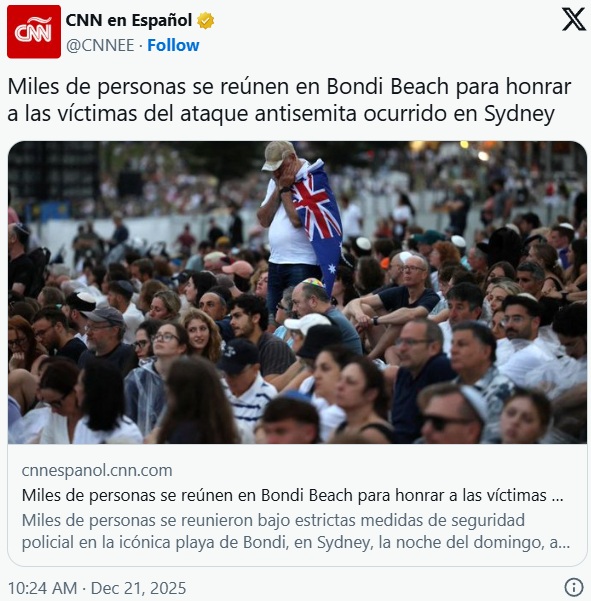 Miles de personas se reunieron bajo estrictas medidas de seguridad policial en la icónica playa de Bondi, en Sydney, la noche del domingo, al cumplirse una semana de que dos hombres armados que atacaron un festival judío mataran a 15 personas. Desde entonces, las autoridades de Australia se han movilizado para enfrentar el antisemitismo y reforzar los ya estrictos controles nacionales sobre armas de fuego.