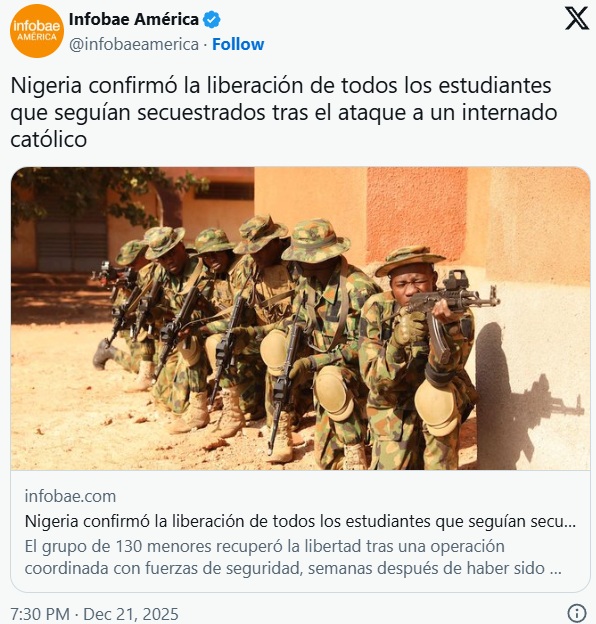 Las autoridades de Nigeria confirmaron este domingo la liberación de los últimos 130 estudiantes que permanecían secuestrados tras un ataque armado contra un internado católico en el estado de Níger, en el centro del país. Con esta operación, el Gobierno dio por concluido uno de los secuestros escolares más numerosos registrados en el país en los últimos años.