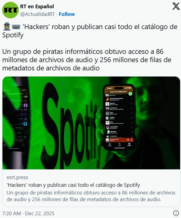Un grupo 'hacker' obtuvo acceso a la mayor parte del catálogo de Spotify, según una publicación en la plataforma de búsqueda de código abierto Anna’s Archive, informa Billboard.