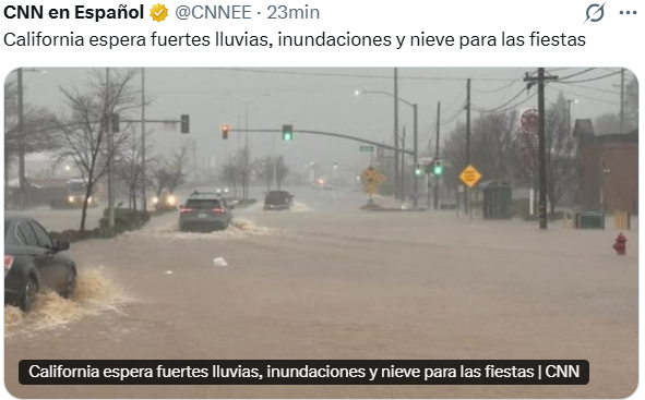 Una peligrosa serie de tormentas provenientes del océano Pacífico afecta el norte de California y las montañas de Sierra Nevada, causando fuertes inundaciones y el cierre de carreteras en varias zonas, en plena temporada de viajes navideños.