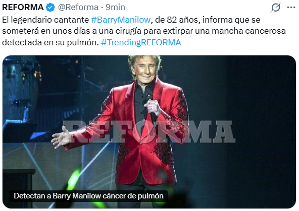 El cantante Barry Manilow anunció que fue diagnosticado con cáncer de pulmón y que se someterá a una cirugía para extirpar una mancha cancerosa.