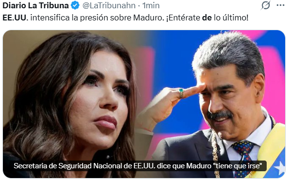 La secretaria de Seguridad Nacional de Estados Unidos, Kristi Noem, afirmó que el presidente de Venezuela, Nicolás Maduro, “tiene que irse”.