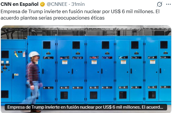 La semana pasada, Trump Media & Technology Group (DJT) sorprendió a Wall Street al anunciar una fusión valorada en US$6 mil millones con TAE Technologies, una empresa líder en energía de fusión y respaldada por Google. El acuerdo implica que el mandatario tendría un interés financiero directo en una compañía cuyo desarrollo podría verse influenciado por decisiones del propio Gobierno que encabeza.
