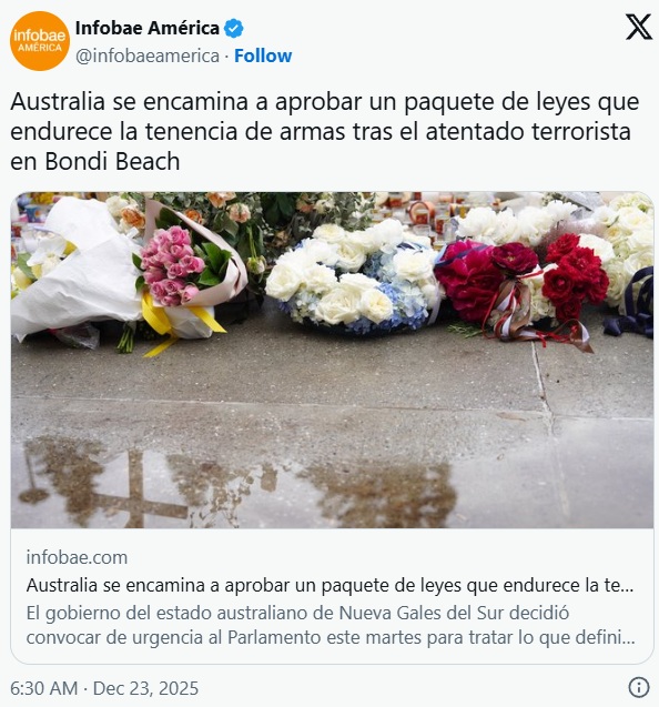 El estado australiano de Nueva Gales del Sur, se encaminó este martes a aprobar un paquete de leyes que endurece de forma significativa el control de armas y otorga a las autoridades la facultad de prohibir protestas tras el ataque armado más letal en décadas, ocurrido durante un evento de Janucá en Bondi Beach, que dejó 15 muertos y que las autoridades describieron como un atentado terrorista antisemita.