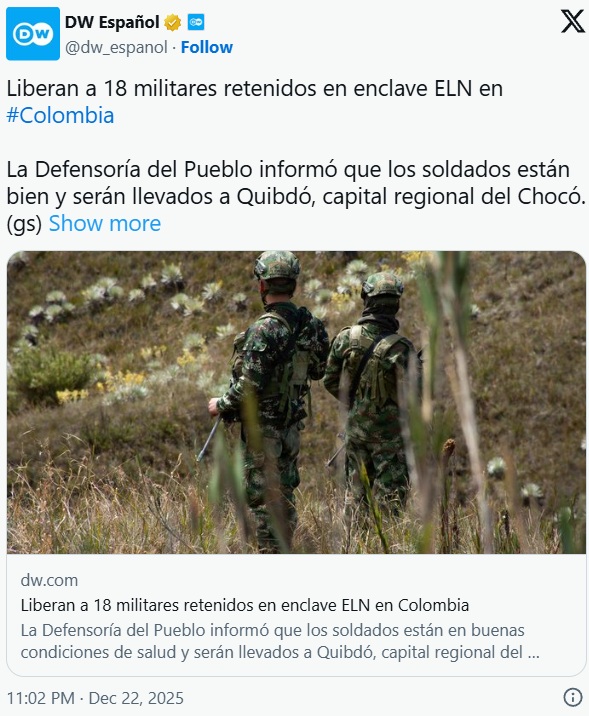 Agregó que los militares están en buen estado de salud y serán trasladados a la capital regional, Quibdó. La retención se dio en medio de un operativo en la zona contra el ELN, que desafía al presidente izquierdista Gustavo Petro luego de fallidos diálogos de paz.