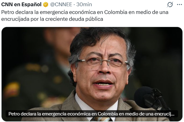 El Gobierno de Colombia declaró este lunes el Estado de Emergencia Económica, Social y Ecológica, una medida excepcional prevista en la Constitución que otorga facultades extraordinarias al presidente para expedir decretos especiales.