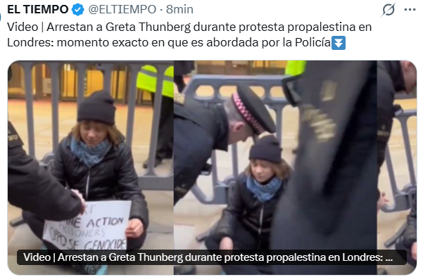 La activista ambiental sueca Greta Thunberg fue arrestada durante una protesta propalestina realizada en Londres, según se observa en un video que comenzó a circular ampliamente en redes sociales este lunes 23 de diciembre.