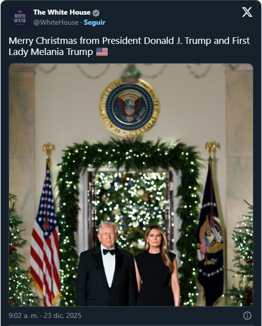 “Feliz Navidad de parte del presidente Donald J. Trump y de la primera dama Melania Trump”, señala el mensaje que acompaña la imagen oficial, en la que ambos aparecen de pie bajo el sello de la Casa Blanca, con una expresión solemne.