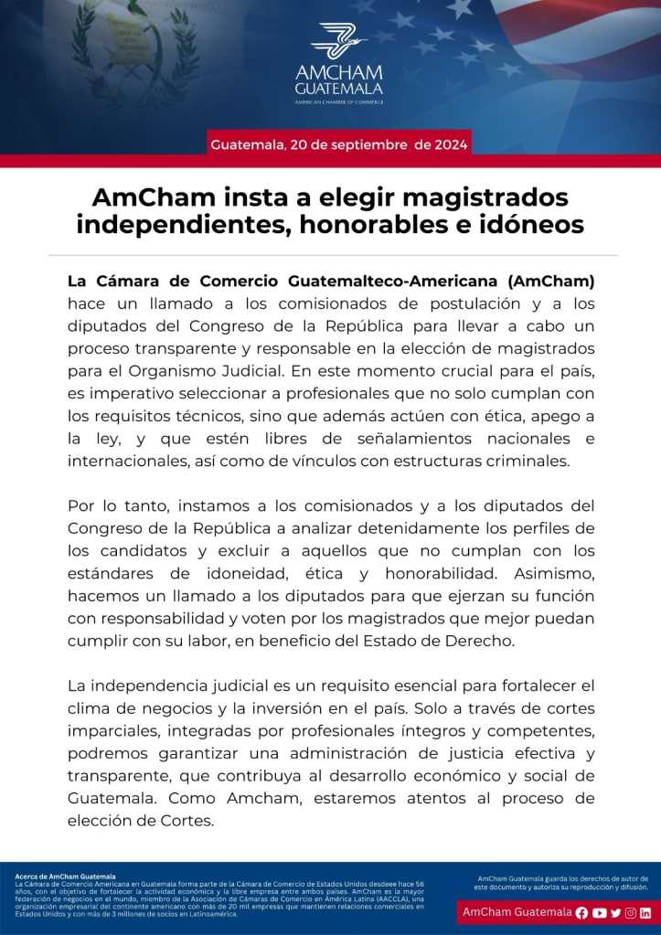 La Cámara de Comercio Guatemalteco – Americana (Amcham) dice que los próximos magistrados deben ser profesionales que cumplan los requisitos técnicos, actúen en apego a la ley y estén libres de señalamientos nacionales e internaciones.