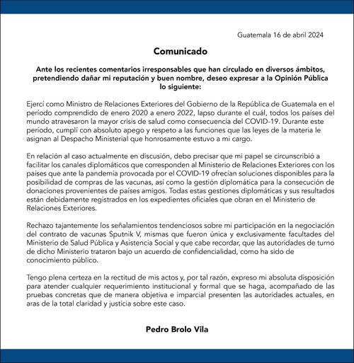 Por medio de un comunicado de prensa, el excanciller Pedro Brolo Vila catalogó como un acto "tajante los señalamientos tendenciosos sobre su participación en la negociación del contrato de vacunas Sputnik".