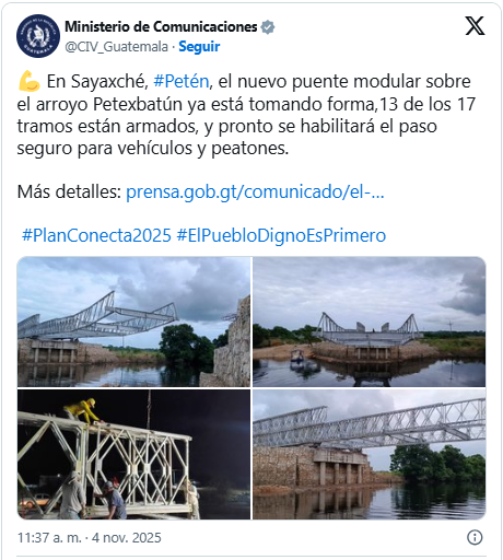El Ministerio de Comunicaciones, Infraestructura y Vivienda (CIV) informó que la instalación del puente modular en la ruta que conduce al municipio de Sayaxché, Petén, registra avances significativos, tras completarse el tramo 13 de los 17 previstos para habilitar el paso.