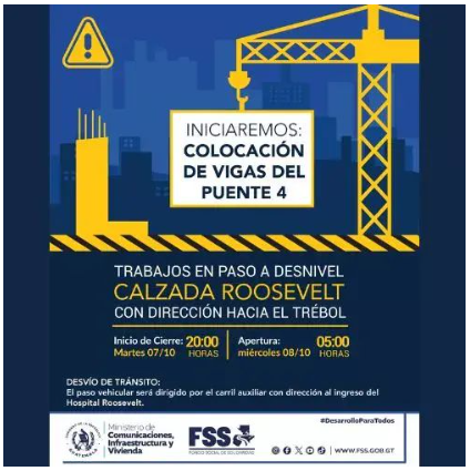 El Ministerio de Comunicaciones, Infraestructura y Vivienda (CIV), a través del Fondo Social de Solidaridad (FSS), informó sobre trabajos en el paso a desnivel de la calzada Roosevelt que afectarán la circulación vial por el sector, debido a cierres temporales.