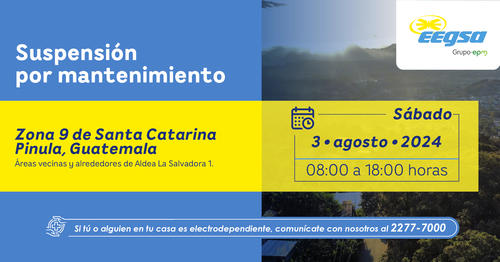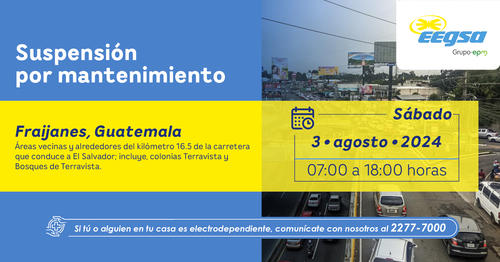 El primer sector afectado este sábado 3 de agosto será Fraijanes, que suspenderá su servicio de luz en las áreas vecinas y alrededores del kilómetro 16.5 de la carretera que conduce a El Salvador, incluye colonias Terravista y Bosques de Terravista.