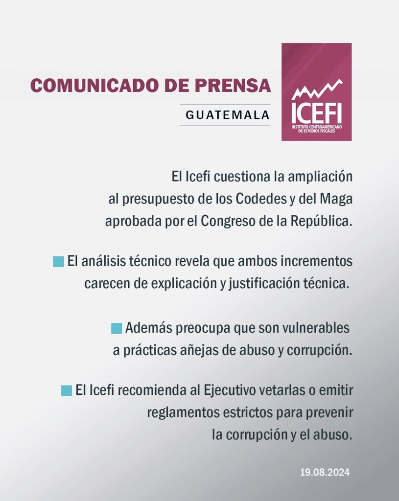 El Instituto Centroamericano de Estudios Fiscales (Icefi) informa que el Congreso de la República ignoró las recomendaciones de no aprobar el aporte extraordinario a los Codede, ya que no especifica la fuente de financiamiento ni justifica el monto.
