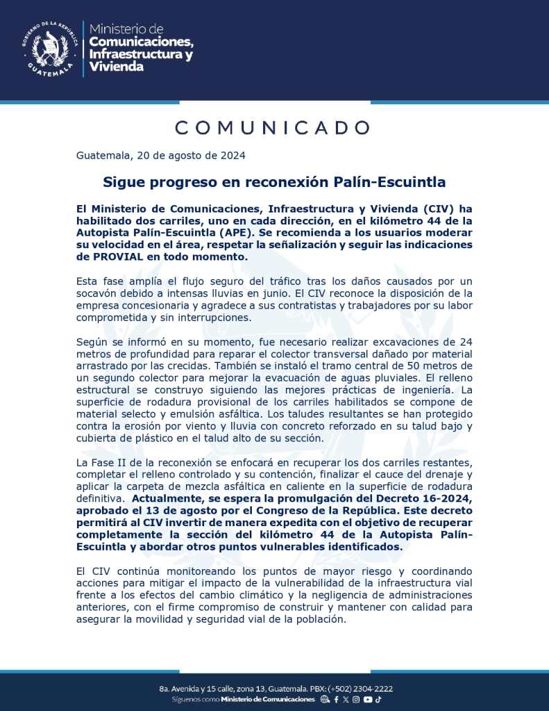 El Ministerio de Comunicaciones, Infraestructura y Vivienda (CIV) informa que la segunda fase de la reconexión del kilómetro 44 en la autopista Palín – Escuintla se enfocará en recuperar los dos carriles restantes, completar el relleno y aplicar la mezcla asfáltica.