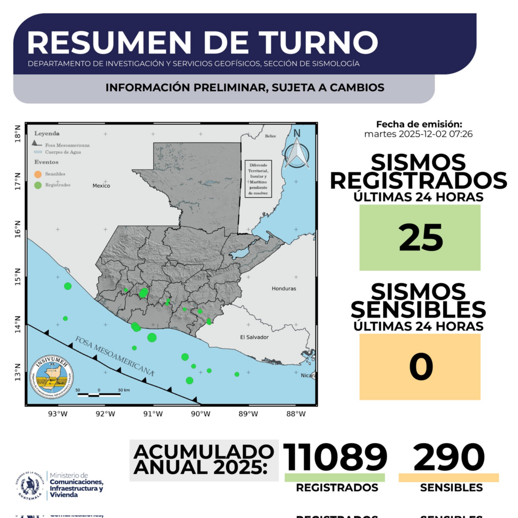 El Instituto Nacional de Sismología, Vulcanología, Meteorología e Hidrología (Insivumeh) informó que en las últimas 24 horas se registraron 25 sismos en el territorio nacional, ninguno de ellos sensible para la población. Con estos nuevos eventos, Guatemala acumula 11,089 sismos en lo que va del año.