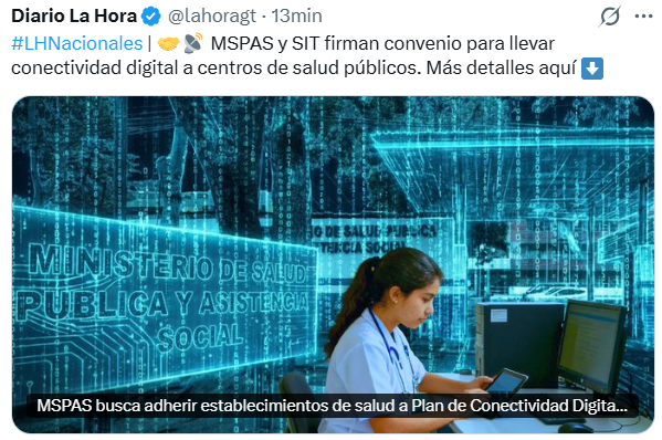 El Ministerio de Salud Pública y Asistencia Social (MSPAS) y la Superintendencia de Telecomunicaciones (SIT) firmaron un convenio de cooperación interinstitucional con el objetivo de incorporar establecimientos de salud al Plan Nacional de Conectividad Digital (PNCD), iniciativa que también incluye centros educativos y comisarías de la Policía Nacional Civil.