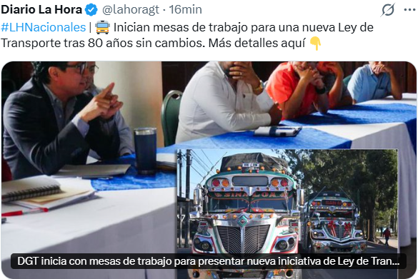 El Gobierno de Guatemala, a través de la Dirección General de Transporte (DGT), dio inicio a las mesas de trabajo destinadas a presentar una nueva iniciativa de Ley de Transporte, con el objetivo de recabar insumos que permitan actualizar un marco normativo que tiene casi 80 años de vigencia.