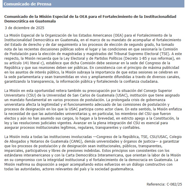 Por medio de un comunicado, la Misión Especial de la Organización de los Estados Americanos expresa preocupación por el Consejo Superior Universitario de la Usac. “La prolongada crisis de gobernanza universitaria afecta la legitimidad y el funcionamiento adecuado de las comisiones de postulación y procesos de designación en los que la Usac participa como actor clave”, indica el comunicado de la instancia interamericana.