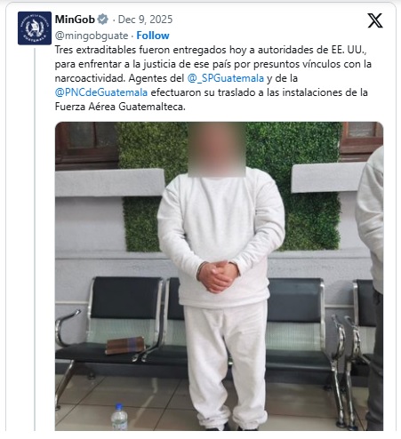 Las autoridades guatemaltecas trasladaron a Estados Unidos a tres hombres requeridos por cortes federales por su presunta participación en redes de narcotráfico. Los extraditados —Edras Gamaliel (“Keka”), Pedro Ángel (“Guerrillero”) y Víctor Hugo (“Chispa”)— permanecían en prisión preventiva en Mariscal Zavala mientras se completaban sus procesos judiciales. Tras cumplirse los trámites correspondientes, fueron entregados a agentes de la DEA en la Fuerza Aérea Guatemalteca, en un operativo coordinado entre el Sistema Penitenciario y unidades especializadas de la Policía Nacional Civil.