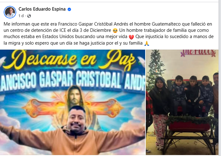 La Cancillería informó que Francisco Gaspar Cristóbal Andrés, un migrante guatemalteco originario de Huehuetenango, falleció el 3 de diciembre en Texas mientras estaba bajo custodia de ICE. Aunque la causa oficial aún no ha sido confirmada, el Consulado de Guatemala en Del Río señaló que, de forma preliminar, el deceso habría sido por causas naturales. El connacional padecía una enfermedad y había sido detenido dos meses antes de su muerte, siendo trasladado en septiembre a El Paso, donde su estado de salud se agravó hasta quedar en condición crítica.