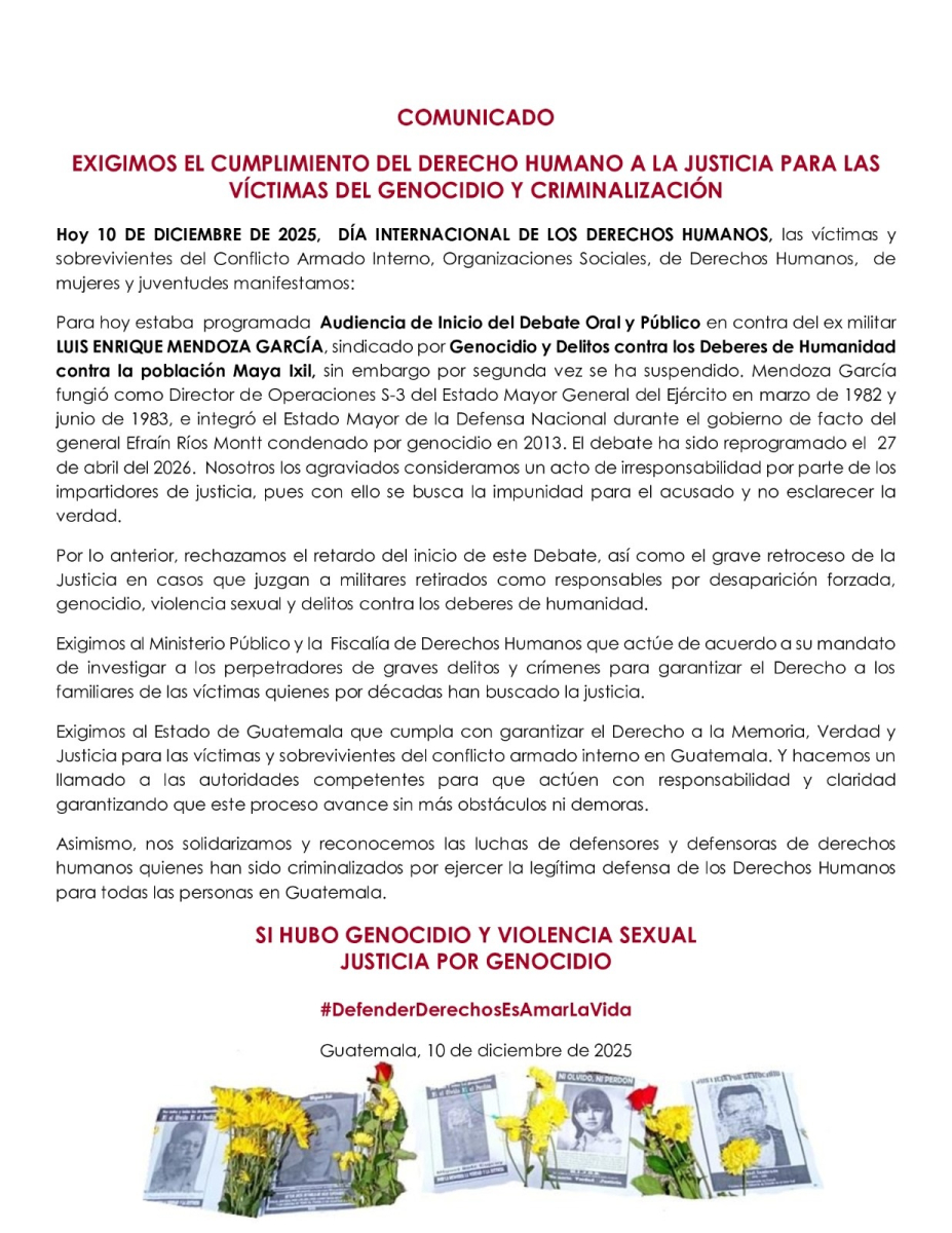 El Tribunal de Mayor Riesgo A volvió a aplazar el inicio del juicio contra el militar retirado Luis Enrique Mendoza, señalado en el caso conocido como “Genocidio Ixil”. El retraso generó reacciones de diversas organizaciones sociales, que aprovecharon el Día Internacional de los Derechos Humanos para exigir que se garantice el acceso a la justicia para las comunidades afectadas. Las agrupaciones recordaron que la audiencia debía iniciar este 10 de diciembre, pero fue suspendida por segunda vez, pese a que Mendoza está acusado de genocidio y delitos contra los deberes de humanidad cometidos contra la población Maya Ixil.