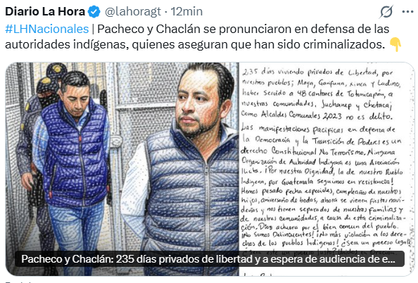 El 11 de diciembre, Luis Pacheco y Héctor Chaclán cumplieron 235 días de permanecer en prisión, luego de haber sido aprehendidos y señalados por delitos como terrorismo, entre otros, debido a su participación en las protestas de octubre de 2023, cuando el Ministerio Público (MP) impulsó acciones para declarar nulas las elecciones generales.