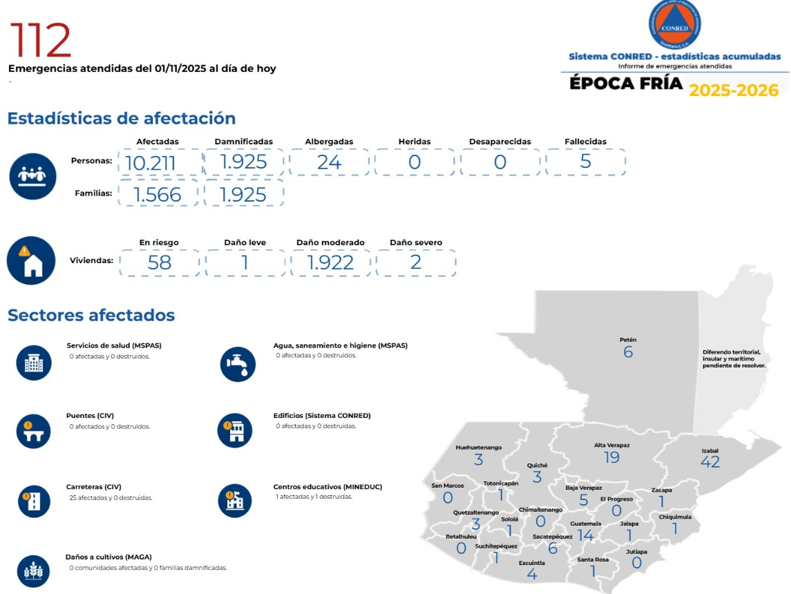 La Coordinadora Nacional para la Reducción de Desastres (CONRED) informó que, según su reporte más reciente, la cifra de incidentes atendidos durante la época fría 2025-2026 se elevó a 112, dejando una afectación total de 10,211 personas a nivel nacional.