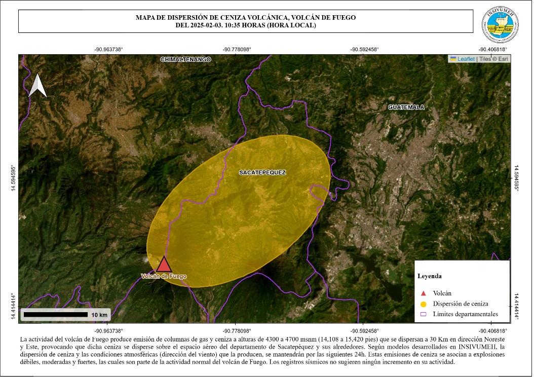 Según el informe, el volcán de Fuego emite columnas de gas y ceniza que alcanzan entre 4,300 y 4,700 metros sobre el nivel del mar.