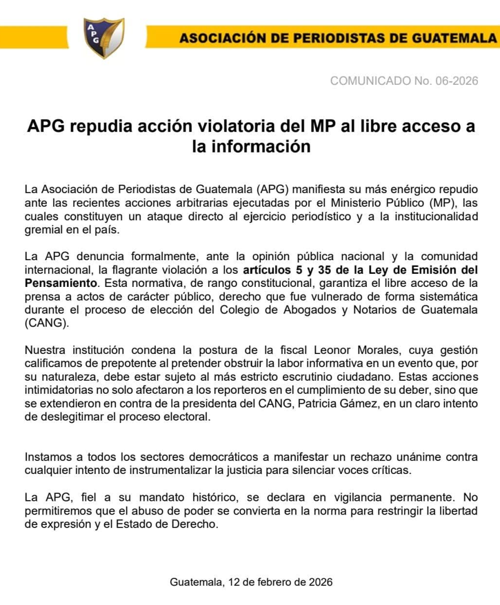 En el comunicado No. 06-2026, la APG denunció públicamente la violación de los artículos 5 y 35 de la Ley de Emisión del Pensamiento, normativa de rango constitucional que garantiza el libre acceso de la prensa a actos de carácter público. Según la gremial, este derecho fue vulnerado de forma sistemática durante el proceso de elección del Colegio de Abogados y Notarios de Guatemala (CANG).