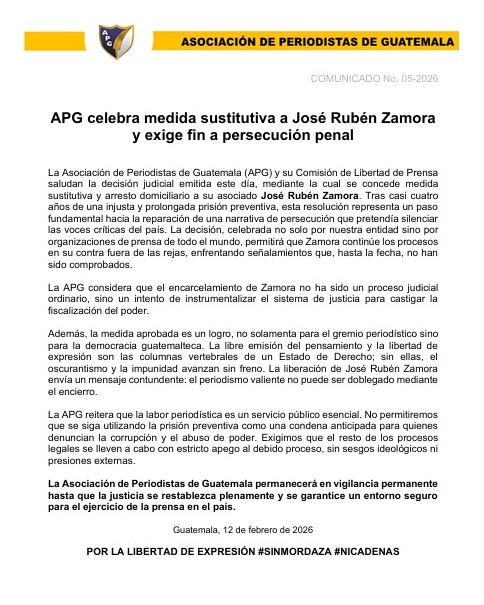La Asociación de Periodistas de Guatemala (APG) celebró la resolución judicial que otorgó medida sustitutiva y arresto domiciliario a José Rubén Zamora, fundador del extinto medio El Periódico, quien permaneció 1,295 días en prisión preventiva.