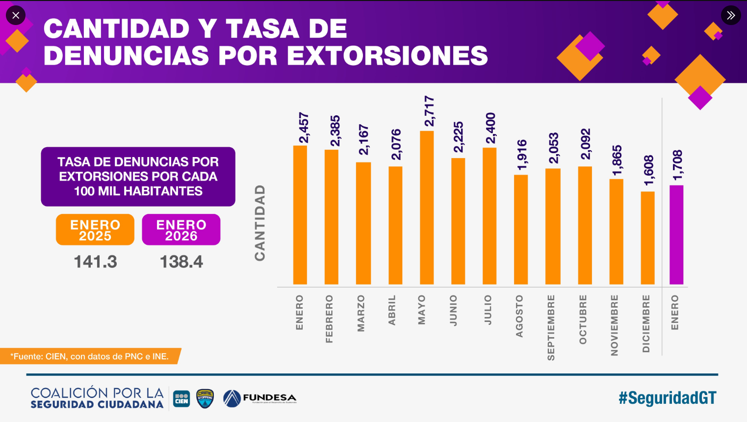 El mes de enero habría registrado una baja en la cantidad de denuncias por extorsión, de acuerdo con datos recopilados por el Centro de Investigaciones Económicas y Nacionales (CIEN). El análisis señala que la cifra refleja una reducción en comparación con el mismo período del año 2025, lo que sugiere una leve mejora en este indicador de seguridad.