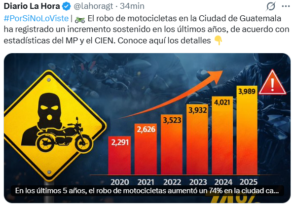El robo de motocicletas en la Ciudad de Guatemala ha registrado un incremento sostenido en los últimos años, según estadísticas del Ministerio Público (MP) y del Centro de Investigaciones Económicas Nacionales (CIEN). Los registros reflejan que este delito continúa en ascenso, lo que ha encendido las alertas entre las autoridades y la población.