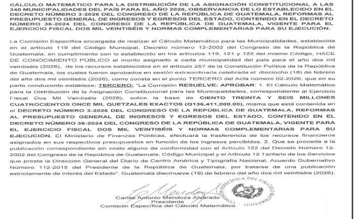 APROBACIÓN DEL CÁLCULO MATEMÁTICO PARA LA DISTRIBUCIÓN DE LA ASIGNACIÓN CONSTITUCIONAL A LAS 340 MUNICIPALIDADES DEL PAÍS PARA EL EJERCICIO FISCAL 2026